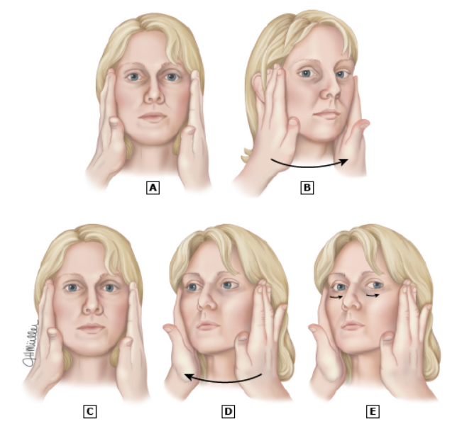Em repouso, solicita-se ao paciente que fixe o olhar em um alvo distante. O examinador gira rapidamente a cabeça do paciente, primeiro para a esquerda (A → B) e depois para a direita (C → D). Resposta normal:os olhos permanecem fixos no alvo (B). Resposta anormal:os olhos são arrastados para fora do alvo (D), seguidos por uma sacada de correção de volta ao alvo (E). Esse achado sugere uma lesão vestibular periférica à direita.